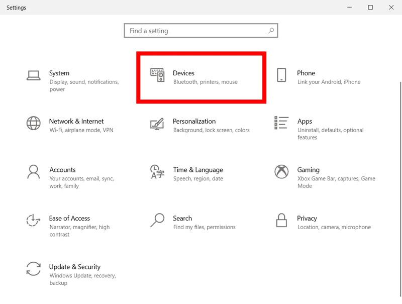 - پس از باز شدن صفحه Settings بر روی گزینه Devices کلیک کرده و از صفحه باز شده گزینه بلوتوث را انتخاب کرده و آن را روشن کنید.