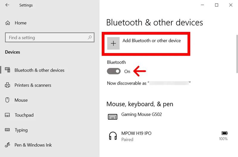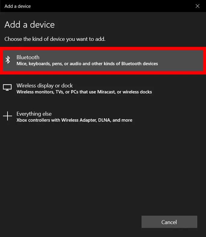 - سپس بر روی گزینه Add Bluetooth or Other Device کلیک کرده و در صفحه باز شده گزینه بلوتوث را انتخاب کرده و از بین گزینههای باز شده نام ایرپاد را انتخاب کنید.
