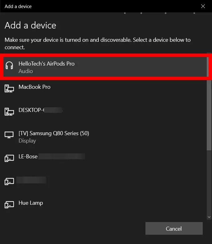 - از آنجایی که قبلا ایرپادها در حالت Paired قرار گرفتهاند، باید نام ایرپاد در صفحه باز شده نمایش داده شود. بر روی نام ایرپاد کلیک کرده تا اتصال ایرپاد به دستگاه صورت گیرد.