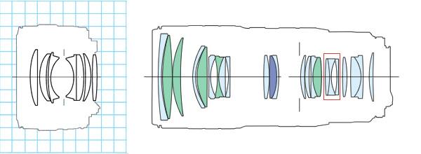 هنوز حوصله دارید ؟ بیایید نگاهی بیندازیم به اینکه میزان تفاوت یک پوشش ساده چقدر خواهد بود. در زیر نمودارهای یک لنز نسبتاً ساده در سمت چپ و یک لنز زوم پیچیده در سمت راست آورده شده است. لنز ساده دارای 12 رابط هوا به شیشه است، لنز پیچیده 32 مورد دارد.