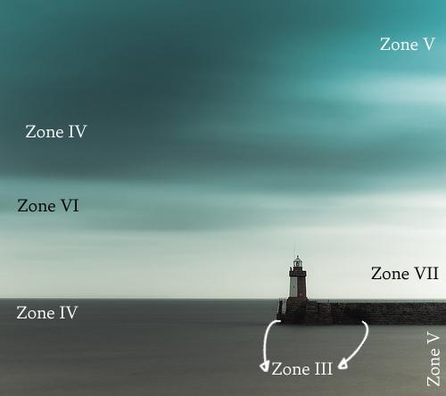 در عکس بالا که از یک فانوس دریایی ثبت شده، دریا تقریبا به عنوان رنگ متوسط ارزیابی شده و باید در ناحیه V قرار گیرد. هرچه در دریا به سمت بالا حرکت میکنیم، شروع به تیرهتر شدن میکند و بخشی از آن در ناحیه IV قرار میگیرد.