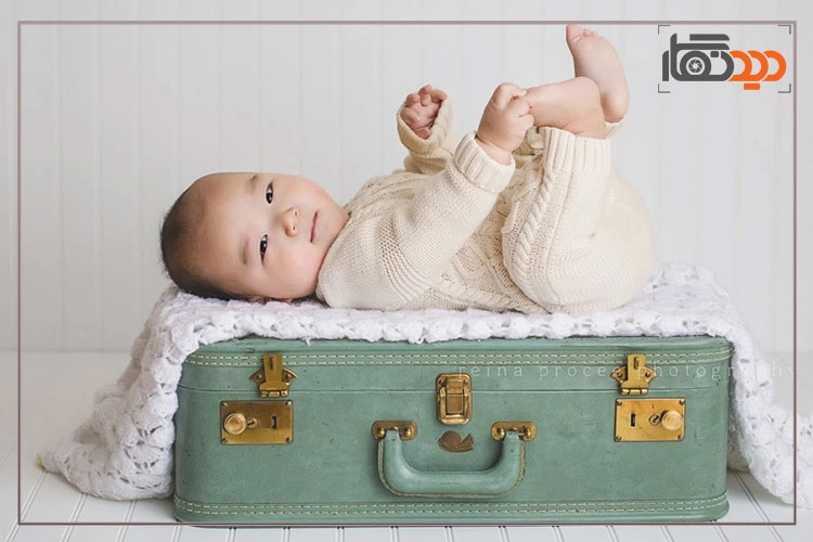 یک سبد حصیری بزرگ، سبد خرید پارچهای یا حتی یک چمدان قدیمی میتواند صحنهای فانتزی برای عکسهای ماهگرد نوزاد بسازد. داخل سبد یا چمدان را با پتو و بالش نرم بپوشانید و نوزاد را به آرامی درون آن بخوابانید. میتوانید چند اکسسوری مثل عروسک، گل یا حتی یک نقشه کوچک اضافه کنید تا حس «سفر کوچک زندگی» را القا کند.