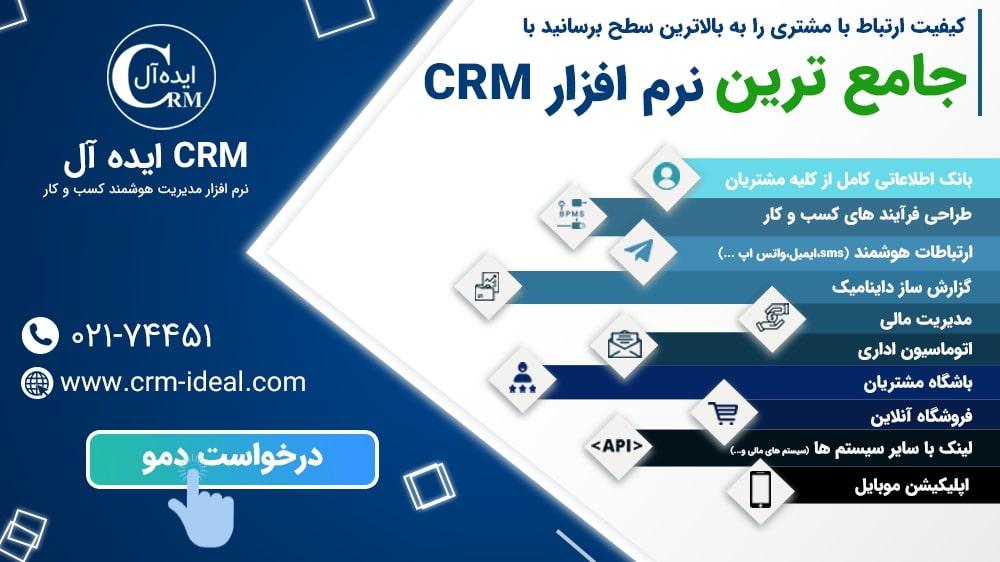 - ارائه دموی 15 روزه رایگان به کاربران برای آشنایی کامل با محیط نرم افزار CRM و اطمینان از کاربردی بودن آن