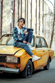 هم تیپ و هم سن ایجاب میکند که سوژه روی یک تاکسی پیکان زرد قدمی بنشیند و ژست عکاسی نشسته با آن بگیرد. من اگر عکاس بودم لنز را قدری پایینتر میگرفتم و به سوژه میگفتم چشمهایت را به لنز بدوز! به نظر من تصویرِ جذابتری با این ژست میشد. نظر شما چیست؟ به نظر شما دست راست چه ایرادی دارد؟