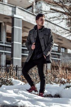 در کنار یک اور کت با یقههای تا نشده که با کفشهای زمستانی سِت است، زانوی خم به سمت راستِ سوژه و نگاه به سوی نور در خلاف جهت زانوی خم همه چیز را طبیعی و زیبا جلوه میدهد. صلابت و قدرت را میتوان در کنار آرامش به نمایش گذاشت. سوژه میتوانست به جای دست در جیب شلوار آن را در جیب کت قرار میداد یا اگر قصد نشان دادن سرما بود کاملاً دست را در جیب فرو میداد. این به طبیعیتر شدن تصویر کمک میکرد.