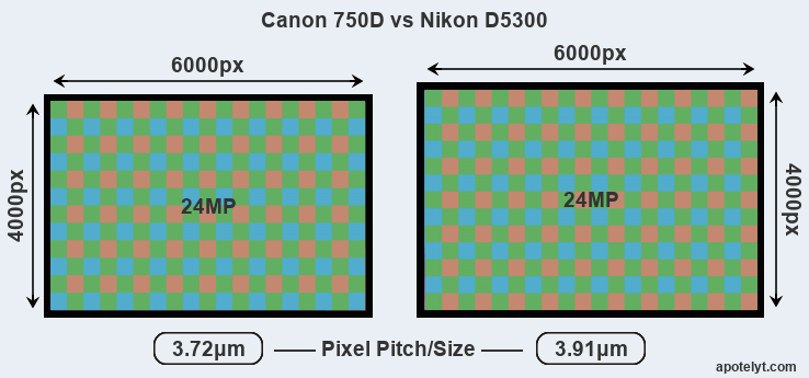 گرچه D5300 حسگر بزرگتری دارد اما هر دو دوربین دارای رزولوشن 24 مگاپیکسلند و این یعنی تراکم پیکسل های D5300 کم تر و سایز پیکسل های آن بزرگتر است. سایز هر پیکسل در D5300 و 750D به ترتیب 3.91 و 3.72 میکرومتر میباشد. سایز پیکسل بزرگتر به معنی نورگیری بهتر است و این به کاهش نویز و افزایش کیفیت تصاویر کمک میکند.