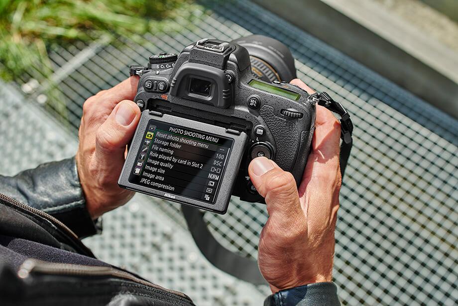 - نیکون D750 : نمایشگر 3.2 اینچی غیر لمسی تیلت شونده از نوع LCD با 1.229 میلیون نقطه، ویزور با ضریب بزرگنمایی 0.7x و پوشش 100 درصدی