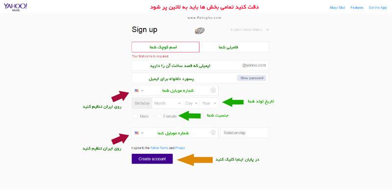 - به سایت https://login.yahoo.com/account/create وارد شده تا صفحه ساخت ایمیل برای شما باز شود.