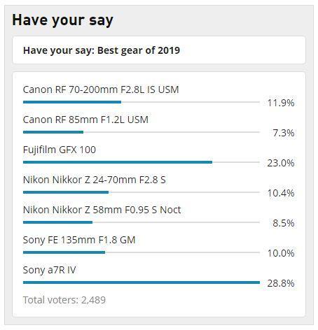 GFX 100 فوجی فیلم نیز با کسب 23 درصد از کل رایهای ثبت شده در جایگاه دوم ایستاد. لنز Canon RF 70-200mm F2.8L IS USM نیز با اختلاف زیادی به رتبه سوم دست پیدا کرد.