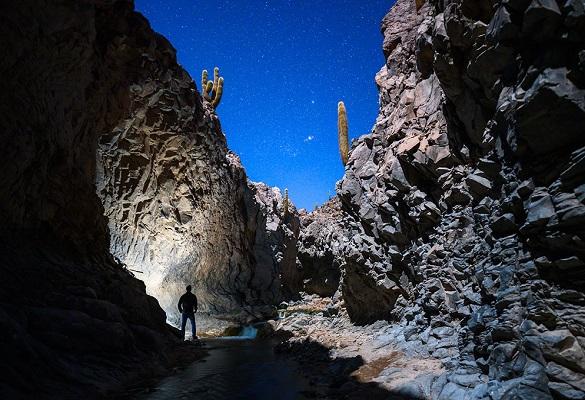 در مورد تصویر بالا؛ کاکتوس در دره گواتین ( شهر اگواسکالینتس، مکزیک ) در صحرای آتاکاما میتواند بیش از 20 فوت قد بکشد، و تیلور اغلب دوست دارد فاکتور انسانی را به این مناظر اضافه کرده و از آنها عکس بگیرد تا احساس متفاوتی را به تصاویرش ببخشد. او میگوید : ” ماه در آسمان بالا رفته بود و از سمت راست نور خودش را به زمین میتابید. من چراغ قوهای را نگه داشتم و نور آن را سعی کردم طوری تنظیم کنم که فضای داخلی سخره را روشن کند. این شکلی شبح وار و مبهم به تصویرم اضافه میکرد. “