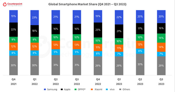 سال 2021 شیائومی توانست جای Apple را که مدتها به عنوان دومین سهم بازار جا خوش کرده بود را بگیرد. روند رو به رشد شیائومی با آغاز 2022 کاهش داشت که مجددا در نیمه دوم سال توانسته سهم خود از بازار را پس بگیرد و در فصل سوم 14 درصد بازار در مقابل 20 درصد سامسونگ را نصیب خود کند. نکته قابل توجه رشد اوپو OPPO بوده که در فصل سوم سال 2023 میلادی بوده است.