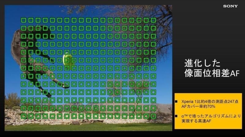 سیستم فوکوس خودکار ردیاب چشم یا Eye AF نیز در این گوشی وجود دارد و پیشرفتهای بسیار خوبی را تجربه کرده است. در اکسپریا 1 این سیستم میتوانست تنها بر روی چشم انسان فوکوس کند، اما در مارک 2 قابلیت قفل شدن روی چشم حیوانات و همچنین انسان وجود دارد. در کنار این قابلیت، اکسپریا 1 مارک 2 از 247 نقطهی فوکوس تشخیص فاز استفاده میکند و 43.200 نقطه هم برای سنسور ToF وجود دارد.