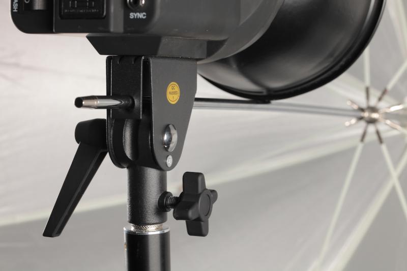اگر از اسپیدلایت استفاده میکنید، باید از یک براکت مخصوص نصب کفشک با یک ظرف چتری تعبیه شده استفاده کنید که اسپیدلایت شما را به یک پایهی سبک تبدیل کند. براکت نصب شدهی کفشک قابل تنظیم یک راه حل مناسب برای عکاسانی است که از اسپیدلایتها استفاده میکنند. این براکت دارای یک ظرف چتر داخلی، دکمهی مخصوص کج شدن است و میتوانید تقریباً هر اسپیدلایتی را روی آنها نصب کنید. هنگام خرید یک براکت پایهی کفشک، مطمئن شوید که پایهی کفشک قابل تنظیم است. پایههای اسپیدلایتها میتوانند متفاوت باشند و ممکن است با هر براکتی هم سازگار نباشند.