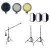 ما در این پکیج با مهمترین اقلام مورد نیاز در آتلیههای عکاسی مواجه هستیم. در این مجموعه 3 پروژکتور وجود دارد که امکان تابش نورهای زرد و سفید و نور ترکیبی توسط آنها وجود دارد. همچنین در پشت آنها صفحه نمایش ال سی دی وجود دارد که کاربر میتواند آخرین تنظیماتی که بر روی آنها صورت داده است را مشاهده نماید. ویژگی دیگر این پروژکتورها امکان تامین برق آنها از طریق برق شهری و همچنین از طریق باتری میباشد. بنابراین از این تجهیزات نورپردازی میتوان به صورت پرتابل و در فضایی خارج از آتلیه عکاسی نیز استفاده نمود. همچنین در پشت پروژکتورها دستگیرههایی طراحی شده است. بنابراین میتوان آنها را به راحتی با استفاده از این دستگاهها جابجا نمود. علاوه بر آن در این پروژکتورها فن خنک کننده نیز به کار رفته است. این فنها علاوه بر ن که کمک میکنند تا بتوان از پروژکتورها برای مدت زمان طولانی استفاده نمود همچنین سبب افزایش طول عمر آنها نیز می گردد.