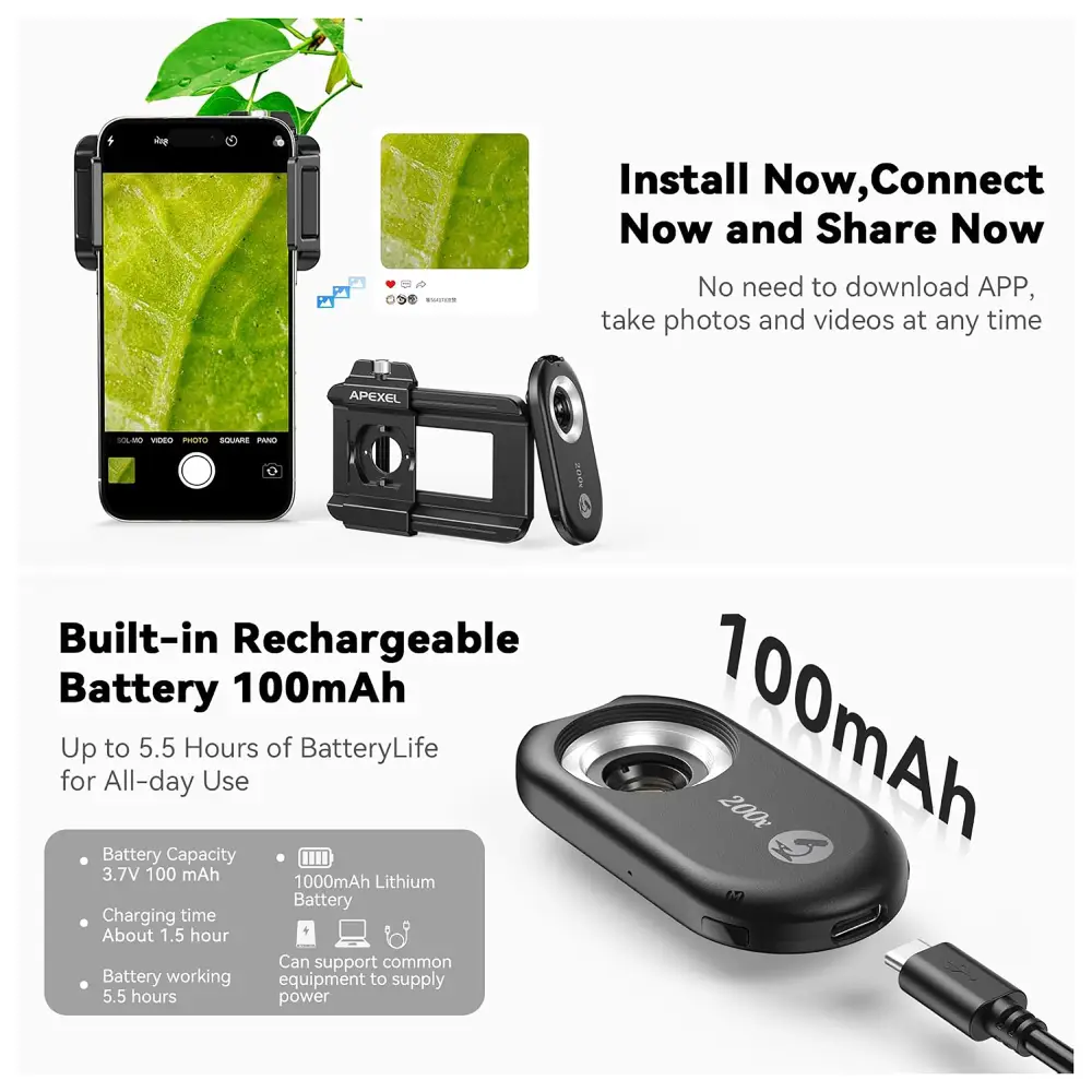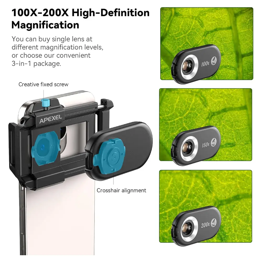 APEXEL 3IN1 100x+150x+200x Lens Kit For Mobile