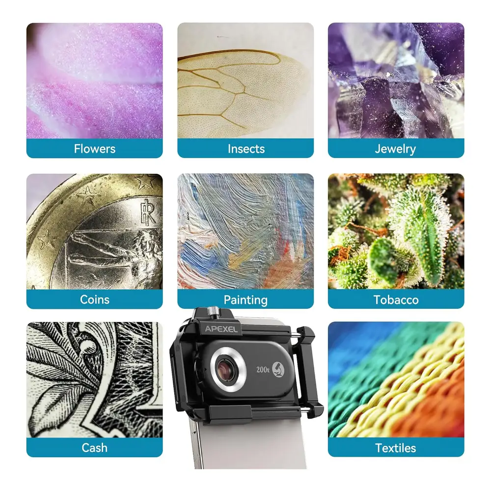کیت لنز موبایل میکروسکوپ اپکسل APEXEL 3IN1 100x+150x+200x Lens Kit For Mobile