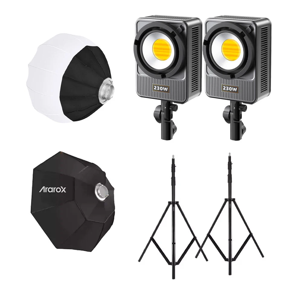 شامل: دو عدد Ararox G230W COB، یک عدد سافت باکس بالونی 65 سانتیمتر، یک عدد اکتاباکس 90 سانتی متر آراروکس، دو عدد سه پایه نور ایلکین iA-260LS