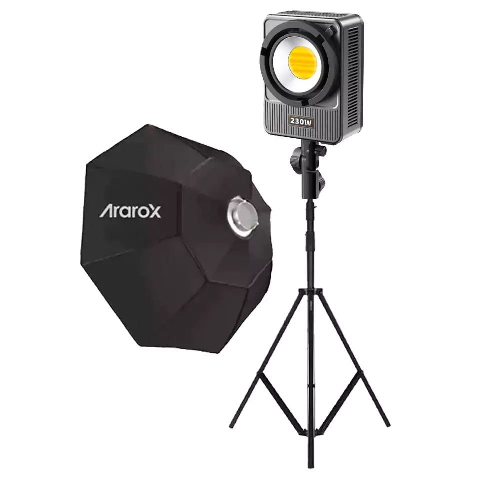 شامل: یک عدد Ararox G230W COB، یک عدد اکتاباکس 90 سانتی متر آراروکس، یک عدد سه پایه نور ایلکین iA-260LS