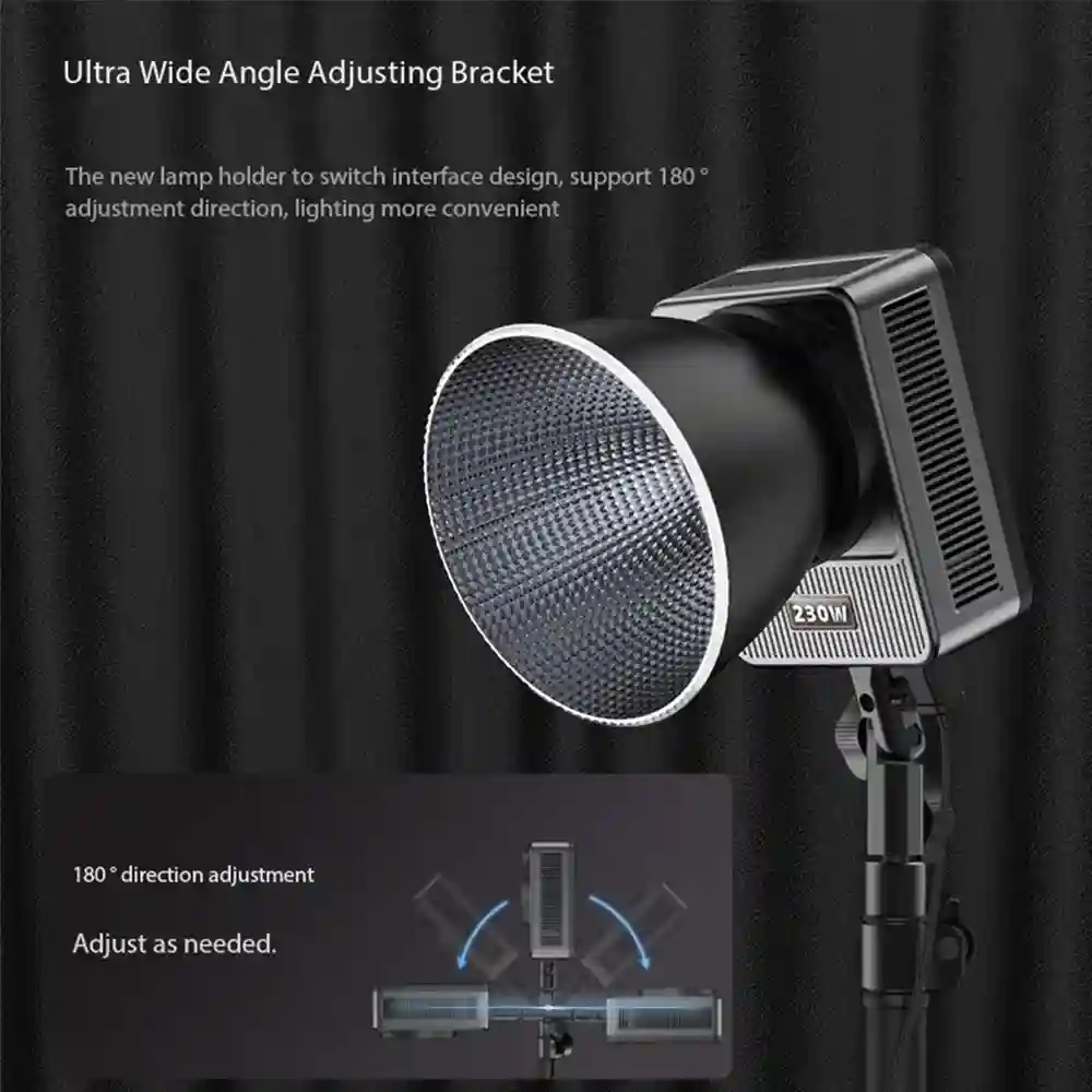 Ararox G230w مجهز به یک پایه قابل تنظیم با زاویه بسیار وسیع است که امکان چرخش 180 درجه را فراهم میکند. این ویژگی به کاربران اجازه میدهد تا نور را چه برای نورپردازی مستقیم و چه برای ایجاد افکتهای نوری خاص، دقیقاً در جهت مورد نظر خود تنظیم کنند.