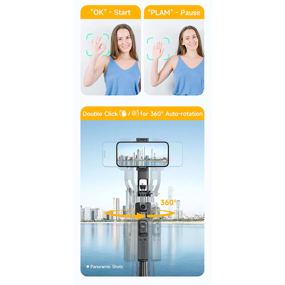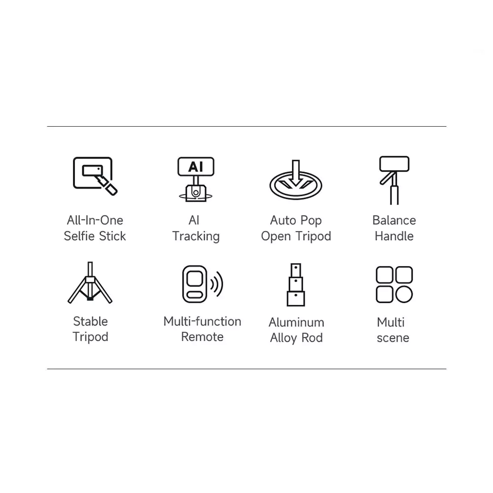 از مزایای مهم این پایه دوربین میتوان به گیمبال داخلی با باتری 850 میلیآمپرساعت اشاره کرد که در حالت چرخش تا 1.3 ساعت کار میکند. همچنین، ردیابی هوشمند چهره و کنترل با اشاره دست مثل مکث با کف دست، تجربهای تعاملی و هوشمند فراهم میکند.