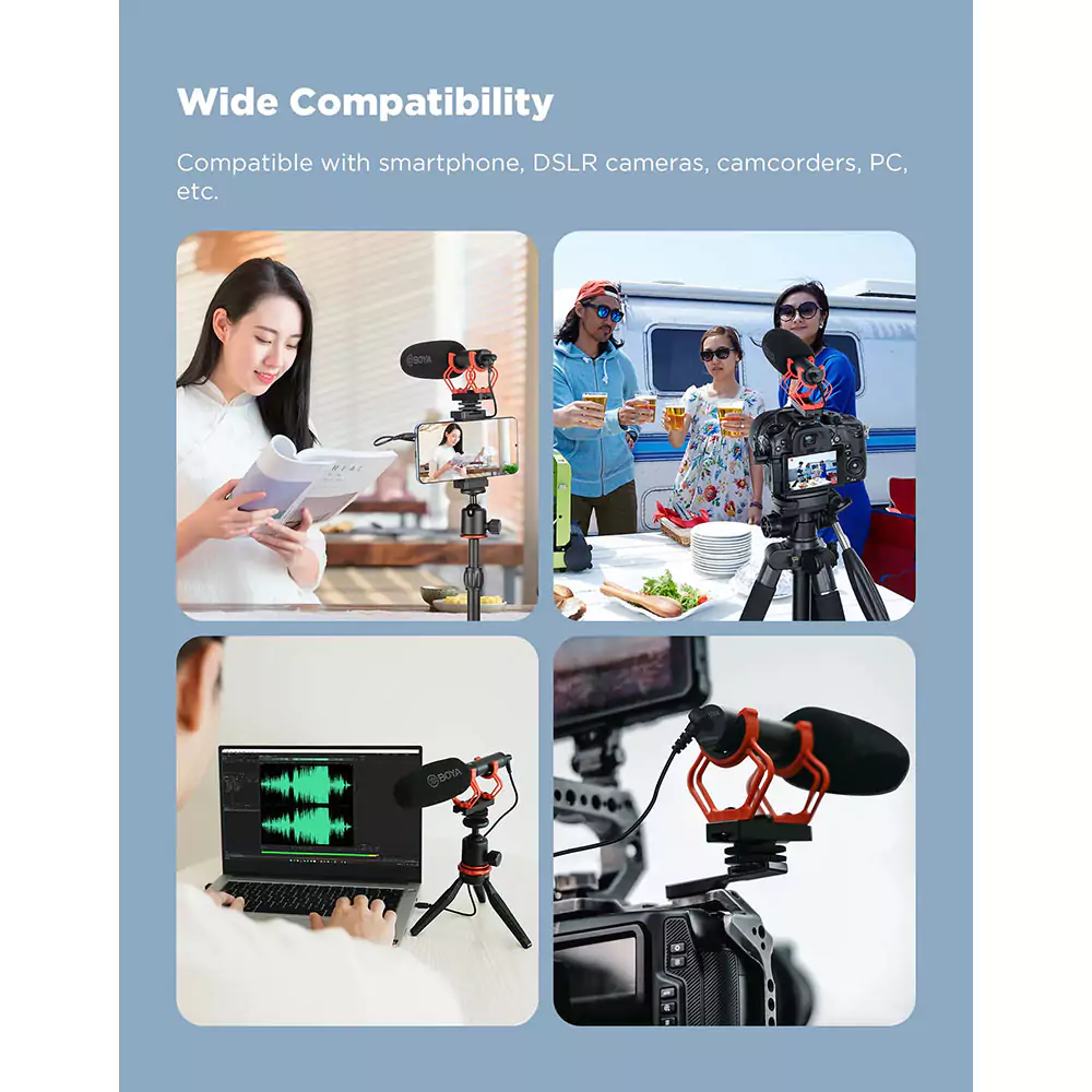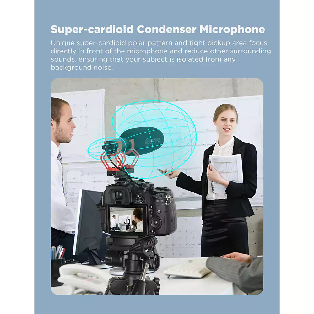 محیط ضبط: میکروفون شات گان BOYA BY-BM2040 برای محیطهای پر سر و صدا و فضای باز مناسب است، زیرا با الگوی سوپرکاردیوئید خود، صدا را از جلو دریافت میکند و صدای محیط را کاهش میدهد.