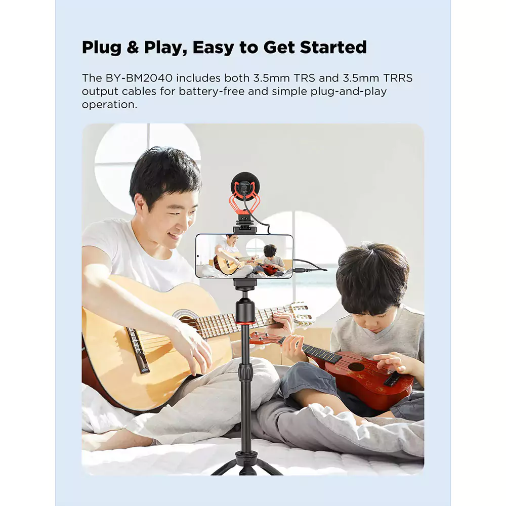 طراحی Plug-and-Play: یکی از ویژگیهای برجسته میکروفون BOYA BY-BM2040، طراحی Plug-and-Play آن است که اجازه میدهد بدون نیاز به نصب نرمافزار یا تنظیمات پیچیده، به راحتی از میکروفون استفاده کنید. کافی است میکروفون را به دستگاه متصل کرده و بلافاصله شروع به ضبط صدا کنید.