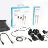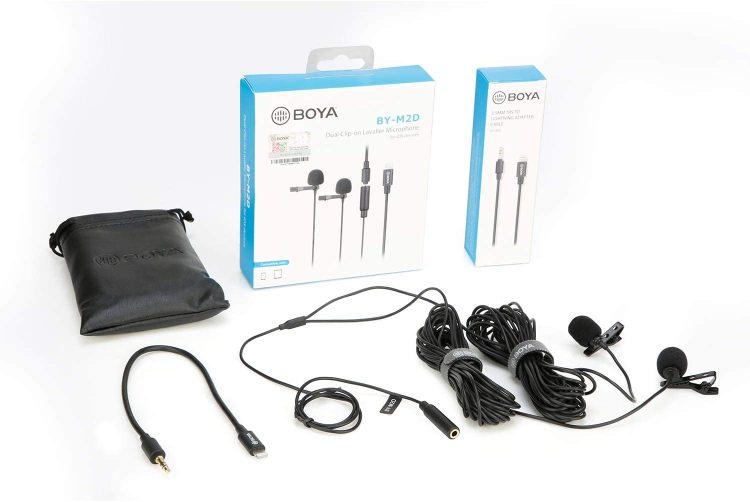 درون جعبه BOYA BY-M2D دو عدد میکروفون یقه ای، فوم ضد باد، دو گیره یقهای، کابل 3.5 میلیمتری آداپتور TRS به Lightning و یک عدد کیف حمل وجود دارد.