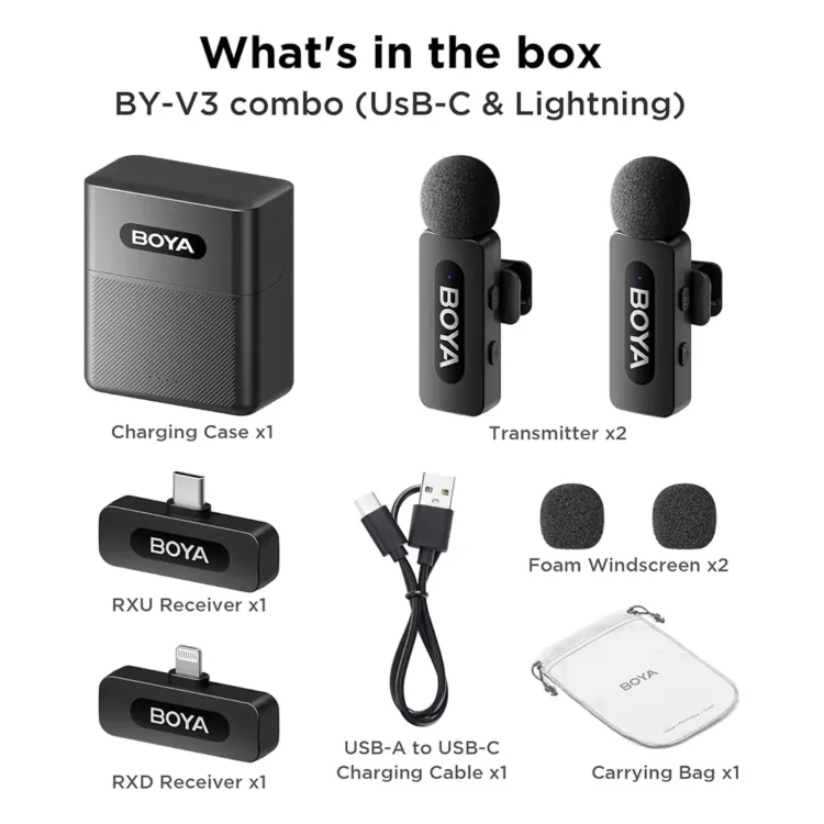 میکروفون بیسیم Boya BY-V3 Combo با ویژگیهایی همچون اتصال بیسیم پایدار، کیفیت صدای عالی، طراحی کاربرپسند و سازگاری با انواع دستگاهها، یک انتخاب بسیار مناسب برای کسانی است که به دنبال یک میکروفون حرفهای با کارایی بالا و قیمت مقرون به صرفه هستند. خرید میکروفون بیسیم بویا BY-V3 Combo برای کسانی که به کیفیت صدای ضبط بالا و تجربه کاربری راحت اهمیت میدهند، گزینهای عالی خواهد بود.