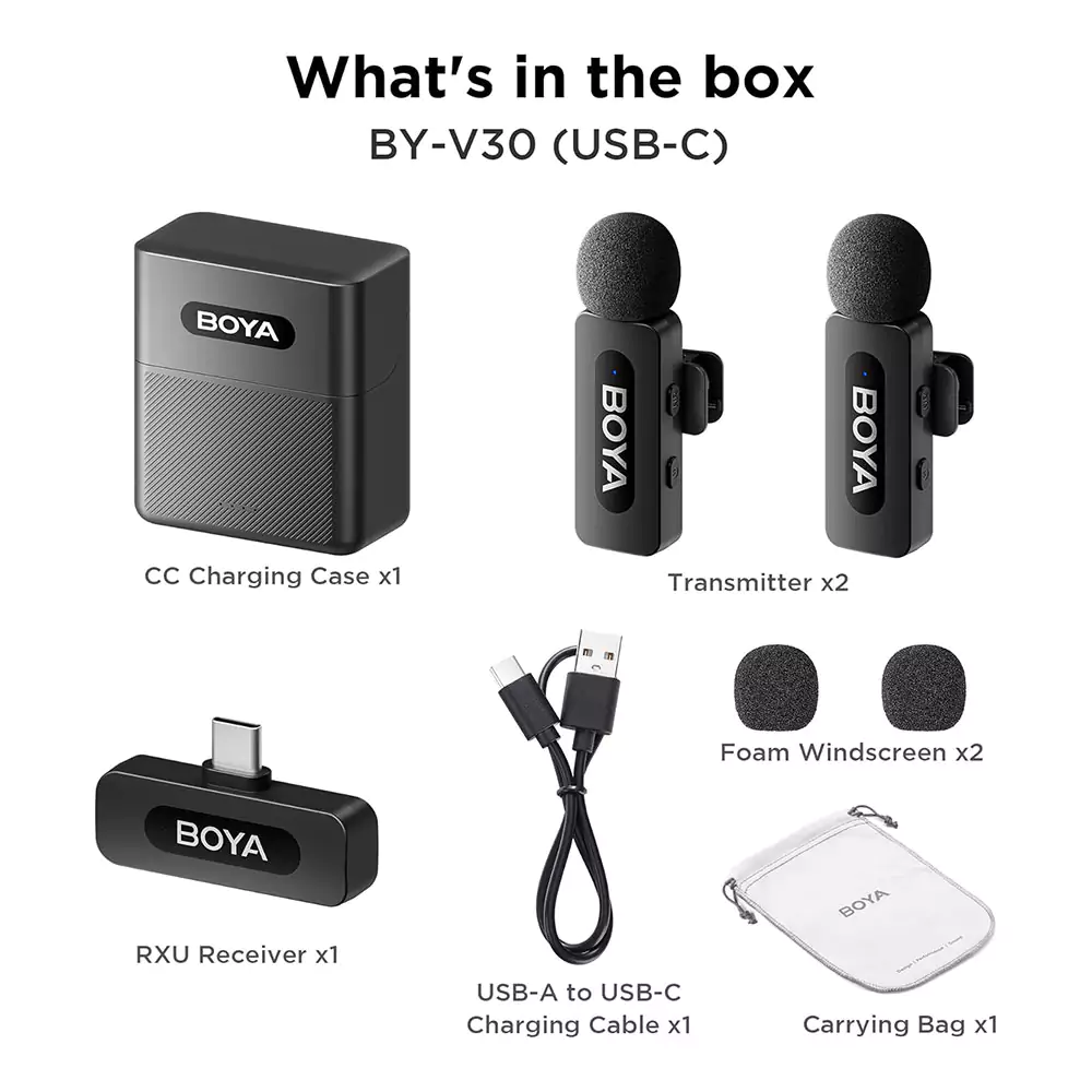 میکروفون بی سیم بویا BY-V30، یکی از جدیدترین مدلهای میکروفون بیسیم شرکت بویا است که برای استفاده با دستگاههایی که از پورت Type-C پشتیبانی میکنند، طراحی شده است.