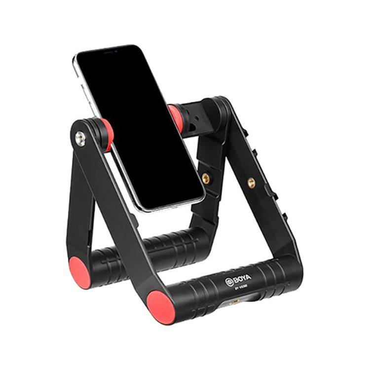 این نگهدارنده با ترکیب رنگ قرمز و مشکی و لوگوی بویا یک ظاهر بسیار زیبا را به نمایش گذاشته است. این هولدر دارای دو دسته است و تا 8 سانتیمتر قابلیت نگهداری موبایل را دارد. شما با توجه به نیاز خودتان میتوانید به صورت افقی و یا عمودی از این نگهدارنده استفاده کنید. این نگهدارنده دارای جای پیچ استاندارد 1.4 اینچی است و از گیرههای محکم و ارگونومیک برخوردار است. هولدر موبایل و میکروفون بویا Boya BY-VG300 از لحاظ فیزیکی ظرفیت کمی را اشغال میکند، تاشونده، جمع و جور و قابل حمل است.