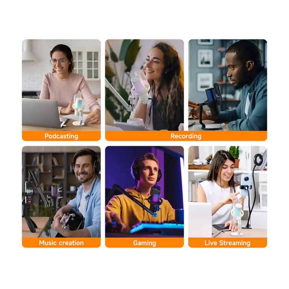 نور RGB میکروفون نیز در چندین حالت مختلف قابل تنظیم است و میتواند به ویدیوهای شما جلوهای خاص و جذاب بدهد. این ویژگی ظاهر میکروفون را زیباتر میکند.