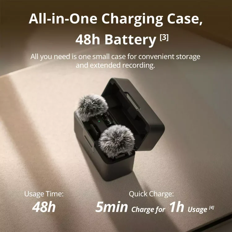 سازگاری گسترده: DJI Mic Mini با انواع دستگاهها، از جمله دوربینهای DSLR، گوشیهای هوشمند (اندروید و iOS) و لپتاپها سازگار است. این ویژگی باعث میشود که نیازی به خرید تجهیزات جانبی اضافی نداشته باشید.