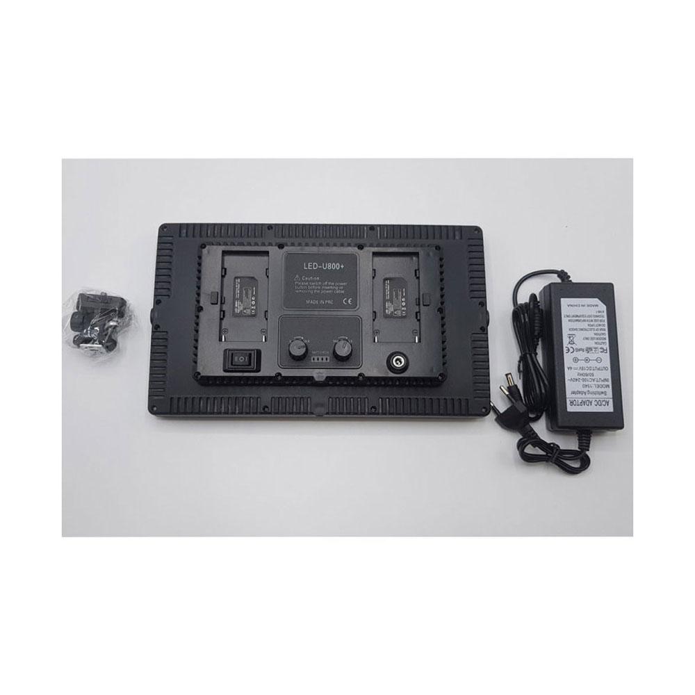 نور ثابت الایدی فوتومکس FOTOMAX U800 LED Light همانطور که از عنوان آن نیز مشخص است، از یک مجموعه 800 عددی از چراغهای LED تشکیل شده است و با ولتاژ ورودی 17 ولت و توان خروجی 60 وات کار میکند. این منبع نور مجهز به دو باتری باکیفیت مدل NP-F570 بوده که به وسیله آداپتور همراه محصول شارژ میگردد. شارژی بودن این چراغ سبب میشود تا امکان استفاده از آن در هنگام عکاسی فضای باز و در محیطهایی که دسترسی دائمی به برق نیست، وجود داشته باشد. نور ثابت الایدی فوتومکس FOTOMAX U800 LED Light از قابلیت تغییر دمای رنگ برخوردار بوده که محدوده آن بین 3200 تا 5600 کلوین تعیین شده است. تغییر دمای رنگ نور سبب میشود تا حال و هوای عکسها متنوع شود. این چراغ را میتوان روی پایه نصب کرده و زاویه آن را متناسب با نیاز تا 180 درجه تغییر داد. تیغههای فلزی (شیدر) قرار گرفته در چهار طرف این چراغ نیز سبب میشوند تا با تغییر زاویه آنها و باز و بسته کردنشان، بتوان نور خروجی را تنظیم کرده و با زاویه دلخواه بر سوژه تاباند. نور ثابت الایدی فوتومکس FOTOMAX U800 LED Light در ابعاد 28×17 سانتیمتر ساخته شده است؛ به همین دلیل امکان جابهجایی آسان آن وجود دارد.
