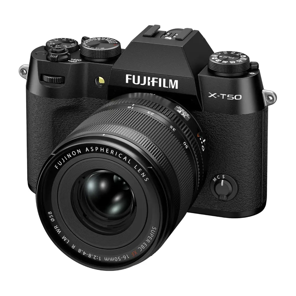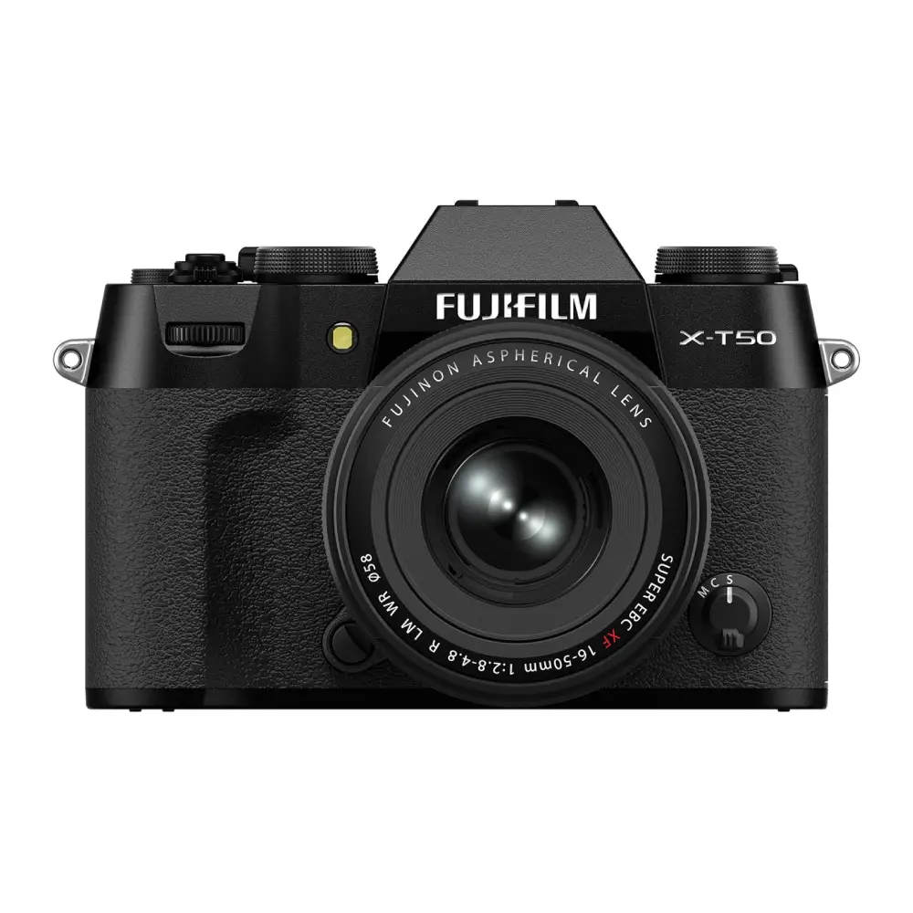 در قلب X-T50 یک حسگر APS-C از نوع X-Trans CMOS 5 HR با رزولوشن مؤثر ۴۰.۲ مگاپیکسل قرار گرفته که تصاویری با جزئیات فوقالعاده و گستره داینامیکی بالا ثبت میکند. این حسگر به همراه لرزشگیر داخلی Sensor-Shift عملکردی چشمگیر در شرایط نوری دشوار ارائه میدهد. لنز همراه 16-50mm با دیافراگم متغیر f/2.8-4.8 پوشش خوبی از واید تا تله کوتاه را برای عکاسی روزمره و حرفهای فراهم میسازد.