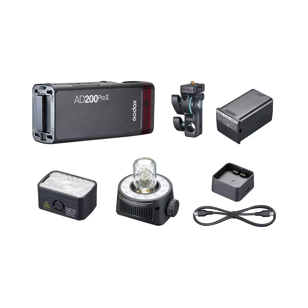 - شامل Speedlite و سر لامپ: فلاش گودکس AD200Pro II شامل Speedlite و سر لامپ است که برای عکاسی دقیق و تنظیمات نورپردازی انعطافپذیری بیشتری به شما میدهد.