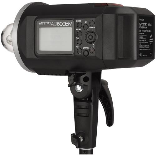 نوردهی TTL فلاش پرتابل Godox AD600 BM WITSTRO در دوربین محاسبه شده است و حدودا زیر توقف است. پایه دارای یک شکاف لوله برای یک میله چتر 5 میلیمتری است. سر فلاش روی هر پایه استاندارد اینچی سوار میشود.