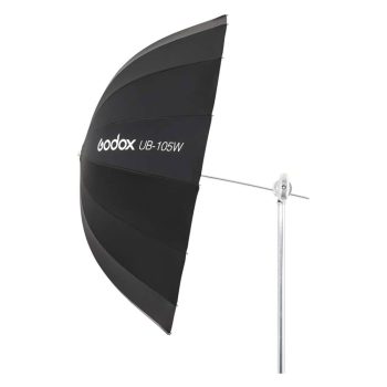چتر پارابولیک گودکس GODOX UB-105W یک چتر با ظاهری گردتر از چترهای معمولی عکاسی است. همچنین ابعاد بزرگتری نیز دارد. جنس آن از نایلون مقاوم بوده و برای استفاده هر نوع فلاش و منبع نوری ایده آل است. چتر عمیق پارابولیک Godox با قطر 105 سانتیمتر، دارای سطح خارجی سیاه و سطح داخلی سفید رنگ است. این چتر برای داشتن شکلی سهمویتر، از 16 میله تشکیل شده و به دلیل سفید بودن سطح داخلی، نوری طبیعیتر و سافتتر منکعس میکند.