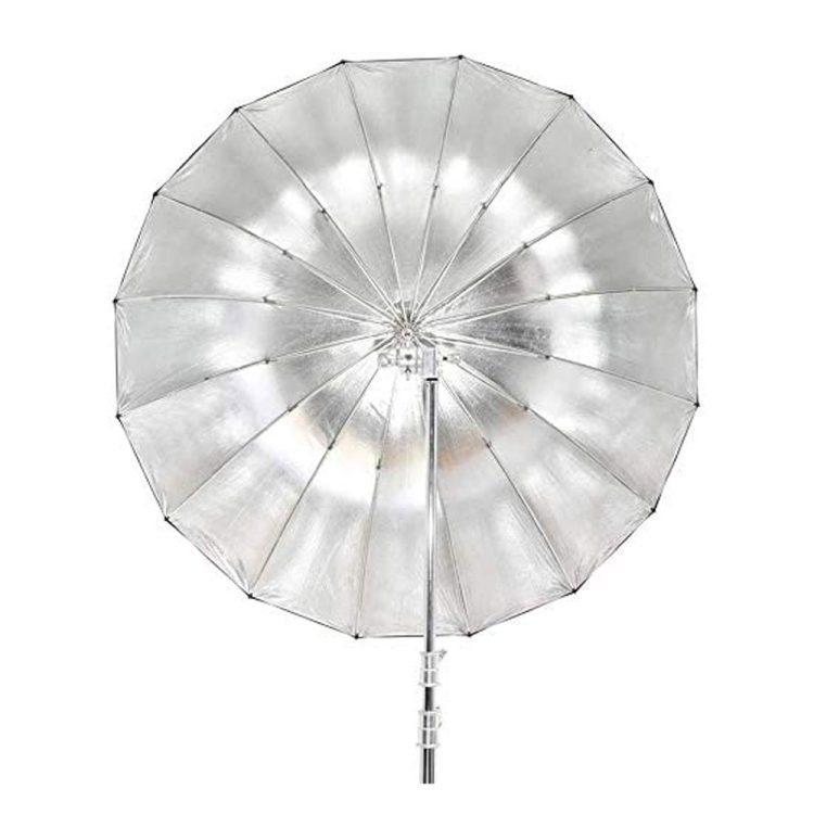 یک چتر نقرهای نور را از هر منبعی به طور مساوی توزیع و پخش میکند. این منبع میتواند لامپهای فلاش، لامپهای نوری یا لامپ فلورسنت عکاسی باشد. کنتراست نور منعکس شده در این چترها، بیشتر از چترهای با سطح داخلی سفید است. اگر به نور نرمتر و ملایمتری نیاز داشته باشید، میتوانید یک دیفیوزر جداگانه تهیه و بر روی چتر خود نصب کنید.