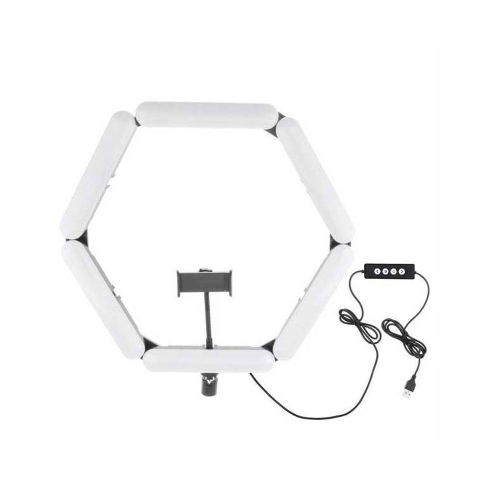 این رینگ لایت، از یک طراحی منحصر به فرد بهره میبرد و 6 بازوی قابل تنظیم دارد. این بازوها، هر کدام 19.5 سانتیمتر هستند. در کنار هر بازو، یک ضامن تعبیه شده که اجازه تنظیم بازوها را به شما میدهد. شما میتوانید نورها را به اشکال مختلف در بیاورید و مربع، مثلت، اعداد و اشکال جذابی مثل ضربان قلب تولید کنید.