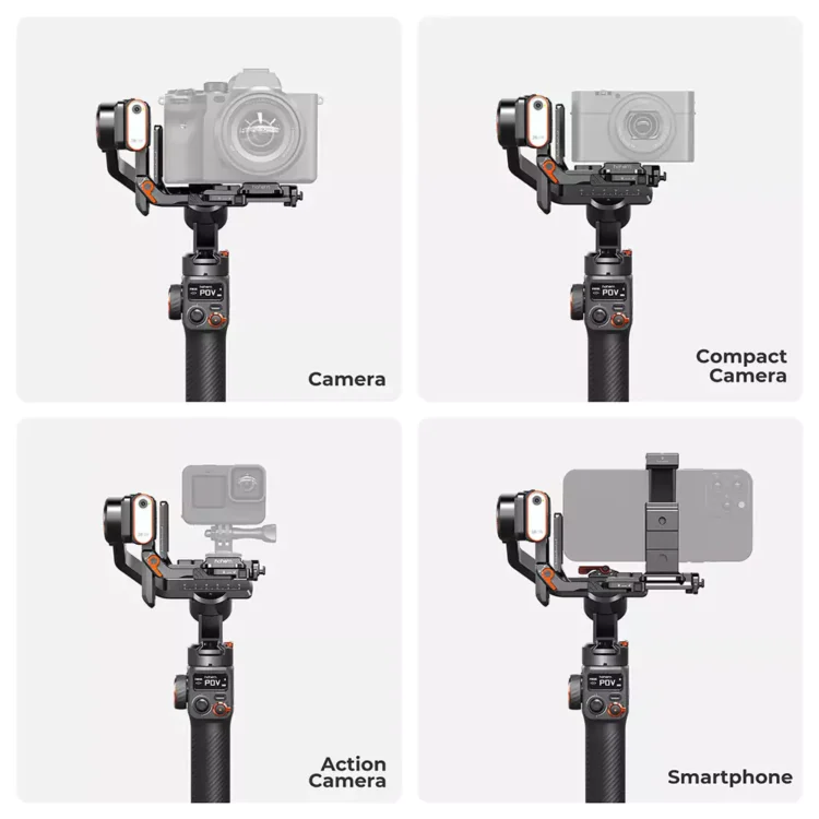 این گیمبال با وزن سبک تنها ۶۵۳ گرم و توانایی تحمل وزن تا ۱.۲ کیلوگرم، برای انواع دستگاهها از جمله گوشیهای هوشمند، دوربینهای اکشن، کامپکت و دوربینهای بدون آینه با لنزهای متصل مناسب است. سیستم MULTI 4.0 QUICK RELEASE به شما اجازه میدهد دوربین را به راحتی جدا کرده و در عرض ۳ ثانیه بین حالت افقی و عمودی جابهجا شوید.