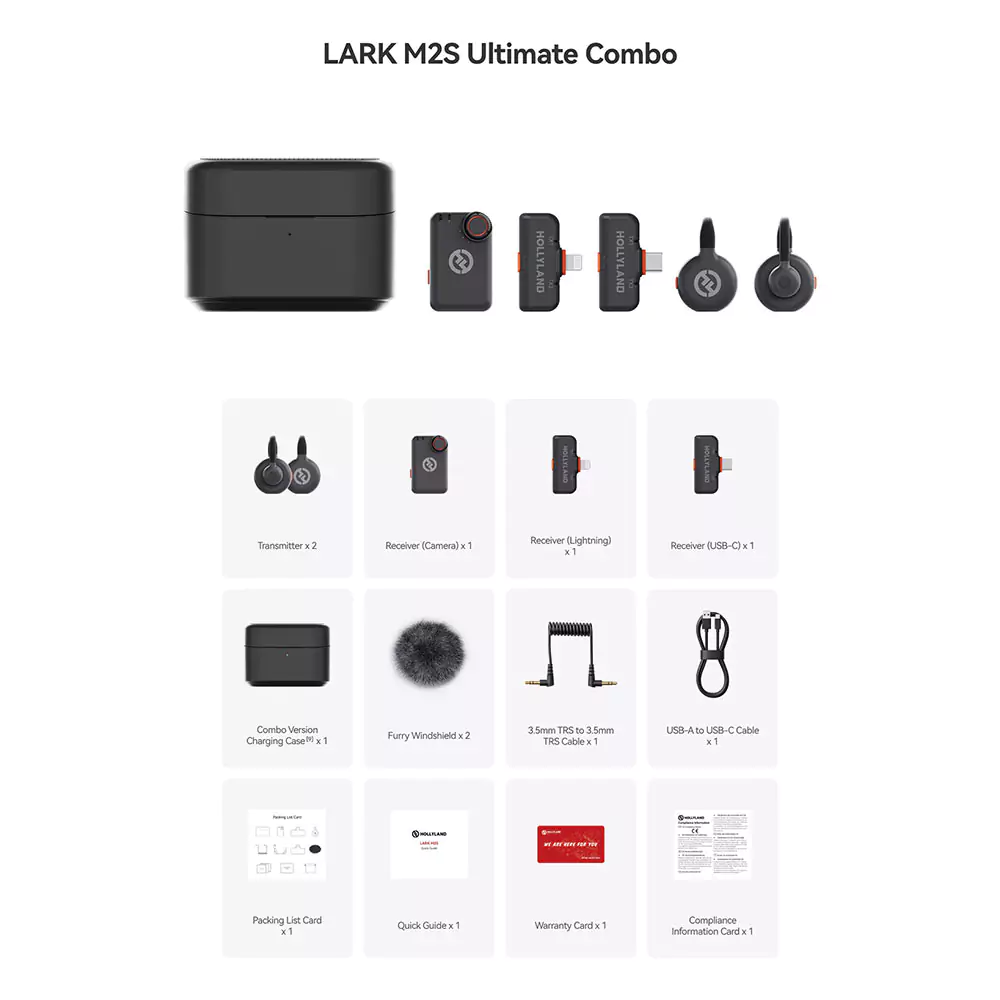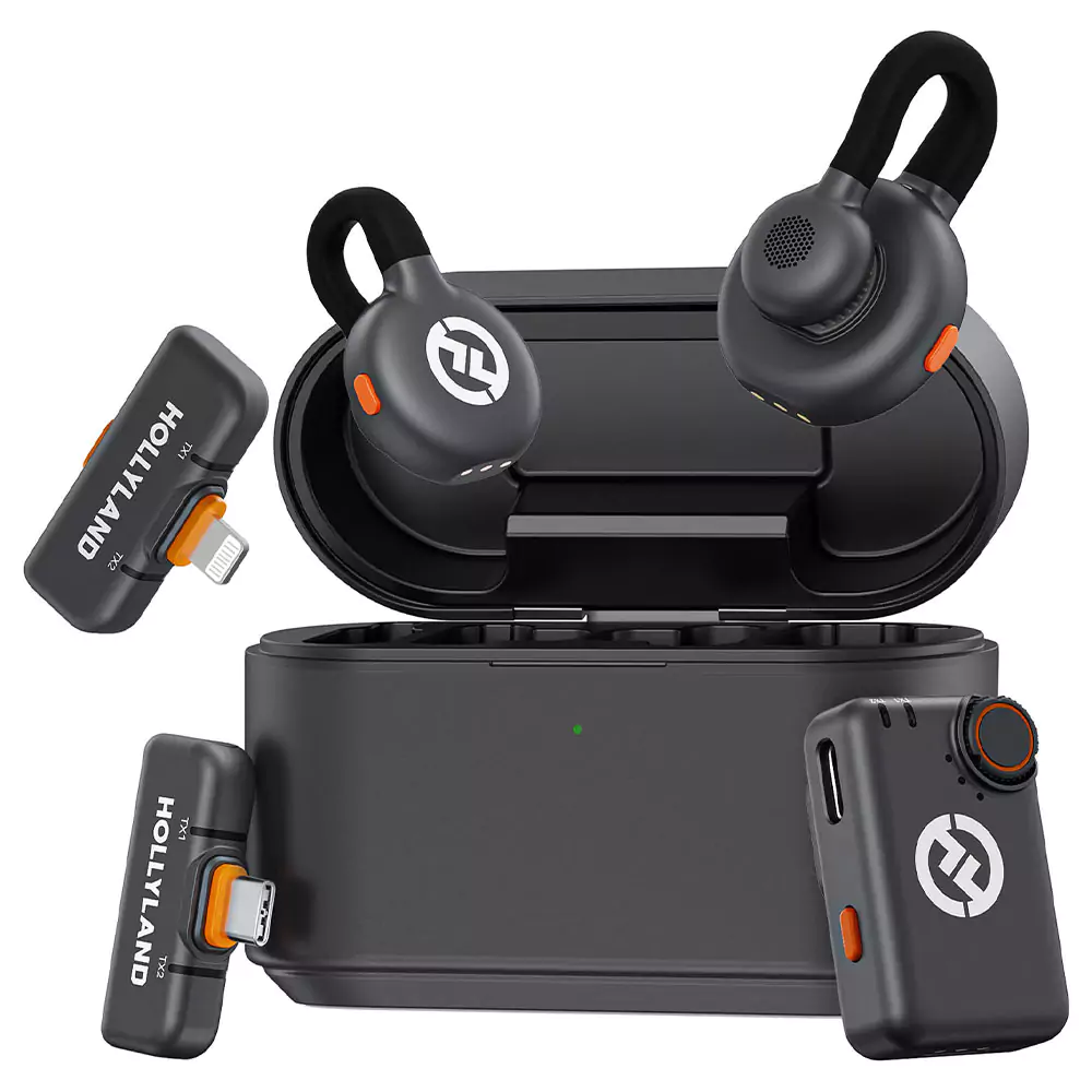 Hollyland LARK M2S از دو فرستنده کوچک و یک یا دو گیرنده بهره میبرد که بسته به نوع استفاده، قابلیت نصب روی دوربین یا اتصال مستقیم به گوشی هوشمند (از طریق USB-C یا لایتنینگ) را دارند. این سیستم در باند ۲.۴ گیگاهرتز فعالیت میکند و میتواند تا فاصله ۳۰۰ متری (1000 فوت) بدون افت کیفیت، صدا را منتقل کند. باتری داخلی هر فرستنده تا ۹ ساعت و گیرنده تا ۸.۵ ساعت شارژدهی دارد و بهلطف کیس شارژ همراه، همیشه آمادهی استفاده است.