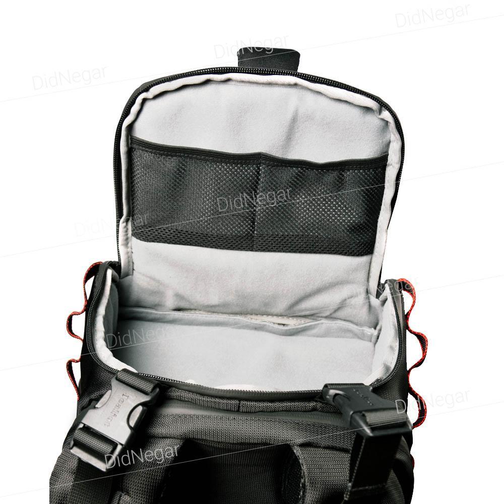 یک دوربین و ۵ لنز جا داره و در صورتی که بخواید میتونید با جابه جایی جداکنندها لوازم دیگه یا یک دوربین دیگه جا بدید ضمن اینکه استقامت خوبی از لحاظ ضربه گیری داره.