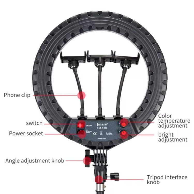 یکی از تجهیزات جانبی دنیای تصویر و برخی مشاغل نظیر سالنهای آرایشی منبع نوری رینگ لایت است. نور آفتاب به عنوان منبع نوری استاندارد همه جا در دسترس نیست. از طرفی در دنیای تصویر ما همیشه به دنبال فراهم کردن نور همهجانبه نیستیم. در ادامه این متن قصد داریم به یکی از منابع نوری شرکت جیماری JMARY با نام رینگ لایت جیماری مدل Fm-14R بپردازیم. بد نیست بدانید، رینگلایت در بین عموم با جلوۀ نور دایرهای شکل که در مردمک چشم ایجاد میکند، شناخته شده است و شاید شما هم به دنبال همین جلوه جذاب باشید. با با همراه باشید تا با این رینگ لایت بیشتر آشنا شویم.