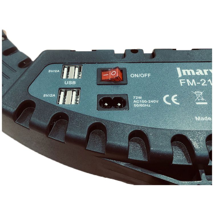 قابلیت تنظیم پانوراما در این رینگ لایت فراهم است. برای اجرای زنده live shooting میتوانید رینگلایت را 360 درجه بچرخانید. با توجه به سه هولدر گوشی در سه پلتفرم به صورت همزمان روی آنتن بروید و لایو اجرا کنید. در رینگ لایت جیماری مدل Fm-14R از تکنولوژی SMD استفاده شده است که لامپها بر اساس لحیمکاری بدون ایجاد سوراخ روی صفحه board ساخته و پرداخته شدهاند. در ساخت این رینگ لایت تعداد 160 SMD LED با سه نور متفاوت و شدت بسیار خوب استفاده شده است. پشت بدنه علاوه بر پورت برق، از 4 پورت USB 2.0 5 ولتی با شدت جریان 2 آمپر برخوردار است. میتوانید گوشی هوشمند یا تبلت خود را در حین کار شارژ کنید.