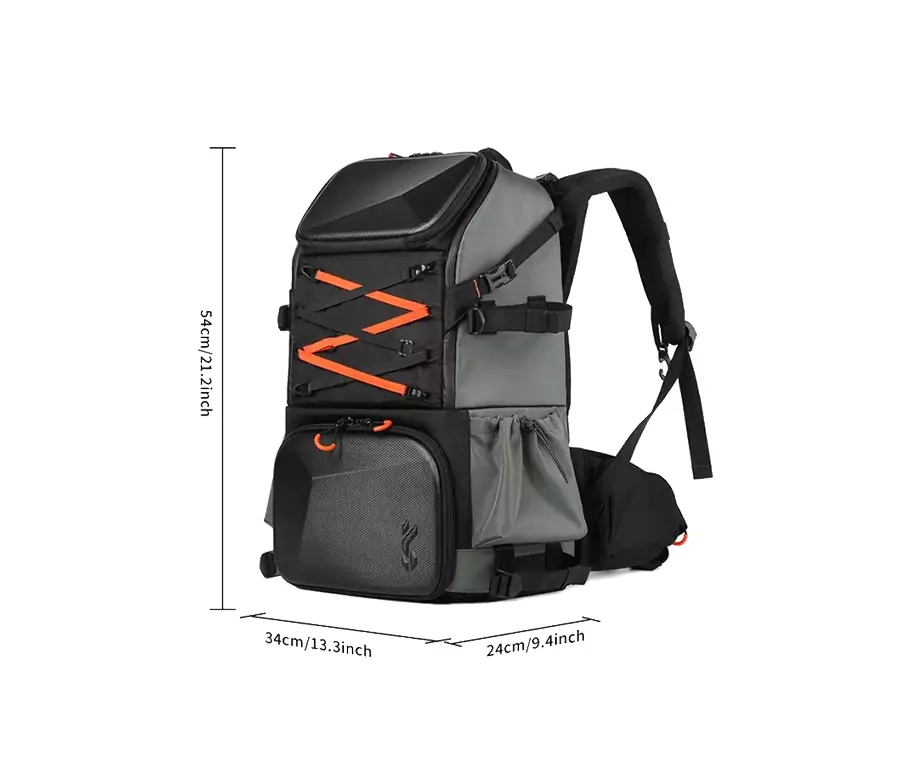 این کیف دوربین با ابعاد خارجی 34×24×54 سانتیمتر طراحی شده و دارای فضای داخلی مناسب برای قرار دادن دوربین، لنزها و لوازم جانبی مختلف است. این کیف دارای چندین جیب جداگانه برای سازماندهی بهتر وسایل است، از جمله یک جیب اصلی با پارتیشنهای جداکننده برای نگهداری دوربین و لنزها. همچنین، این کیف دارای جیبهای متعددی در قسمتهای مختلف خود است که میتوان از آنها برای نگهداری لوازم شخصی، سهپایه، بطری آب و حتی تبلت و لپتاپ استفاده کرد.