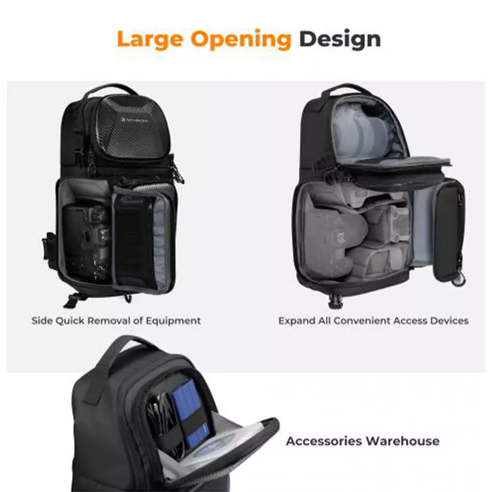بخشبندی داخلی قابل تنظیم و بند شانهای ضد لغزش راحتی حمل را فراهم میکند. طراحی جانبی با باز شدن 270 درجه دسترسی سریع به تجهیزات را ممکن میسازد و یک سگک ایمنی از افتادن دوربین جلوگیری میکند.