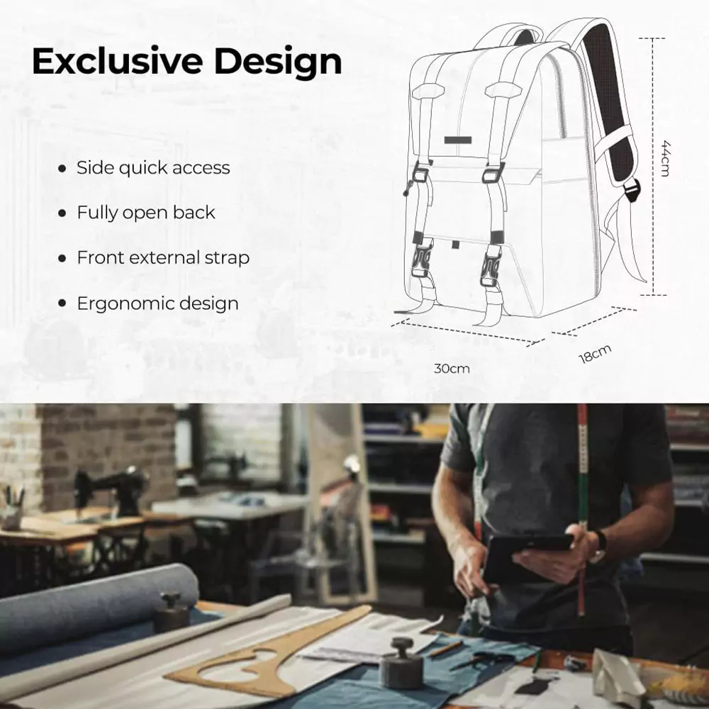 فضای جادار و متنوع: این کیف دوربین طوری طراحی شده است که فضای کافی برای حمل یک یا دو دوربین DSLR، چند لنز اضافی، لپتاپ و لوازم جانبی مختلف دارد. این ویژگی باعث میشود که شما بتوانید همه تجهیزات خود را در یک کولهپشتی جا دهید.