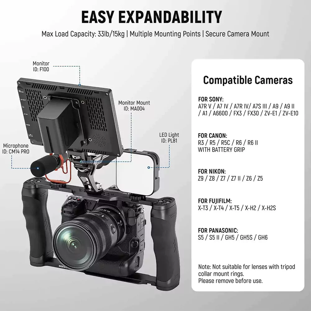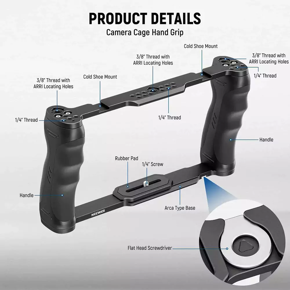 کیج نیور CA016T دارای چندین سوراخ استاندارد ¼ اینچ و ⅜ اینچ است که برای اتصال انواع لوازم عکاسی و فیلمبرداری مانند میکروفون، لایت، و سهپایه طراحی شده است. این ویژگی به شما این امکان را میدهد که برای پروژههای فیلمبرداری یا عکاسی، نورپردازی و صدای با کیفیت اضافه کنید. همچنین، شما میتوانید بهراحتی از سهپایهها و دیگر تجهیزات جانبی برای تثبیت دوربین و بهبود کیفیت تصویربرداری استفاده کنید.