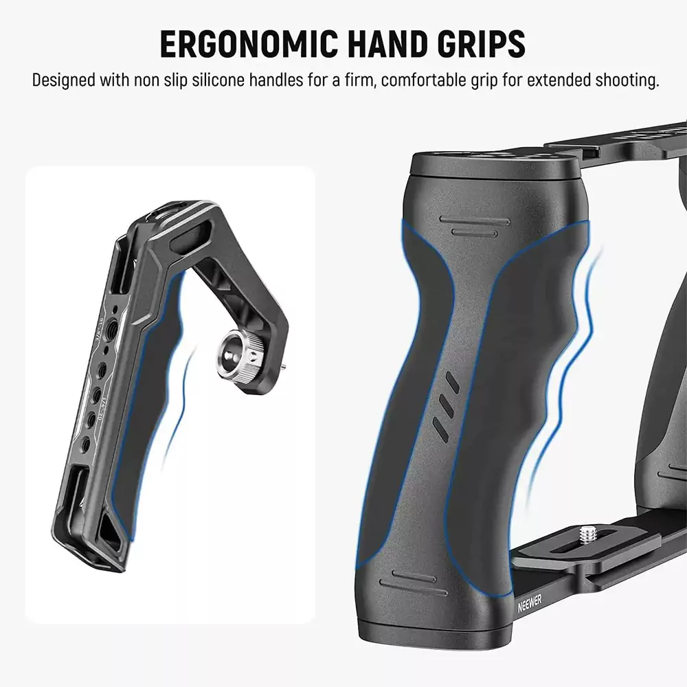 قابلیت اتصال به لوازم جانبی مختلف: شما میتوانید میکروفون، لایت، و دیگر لوازم جانبی را به این کیج متصل کنید. این ویژگی به شما این امکان را میدهد که تجهیزات مورد نیاز خود را بهراحتی اضافه کنید.