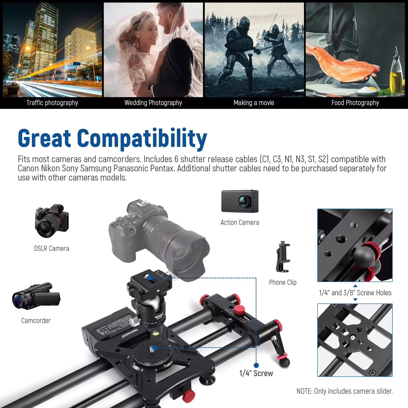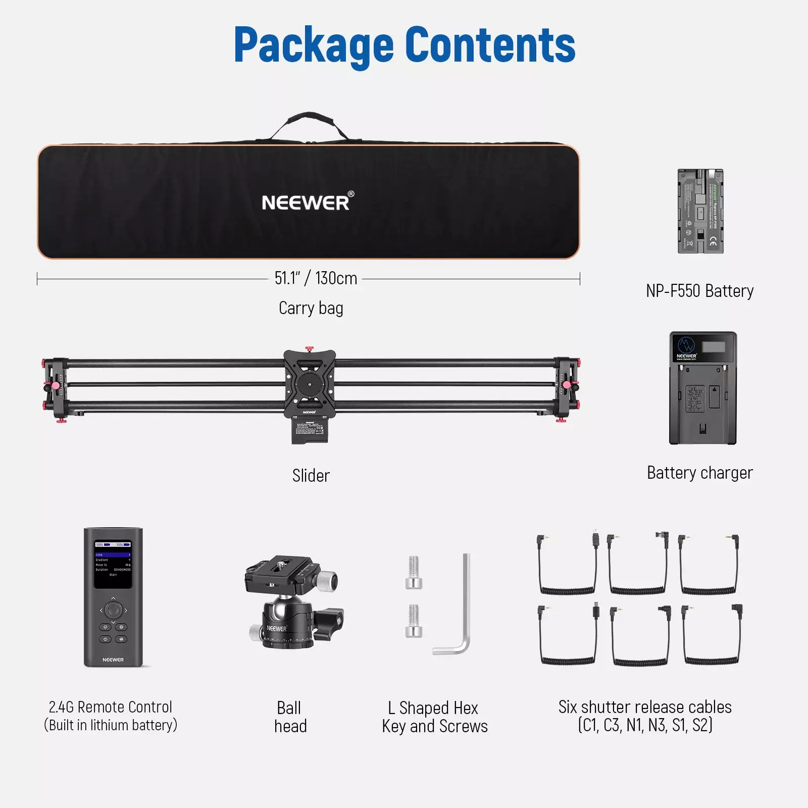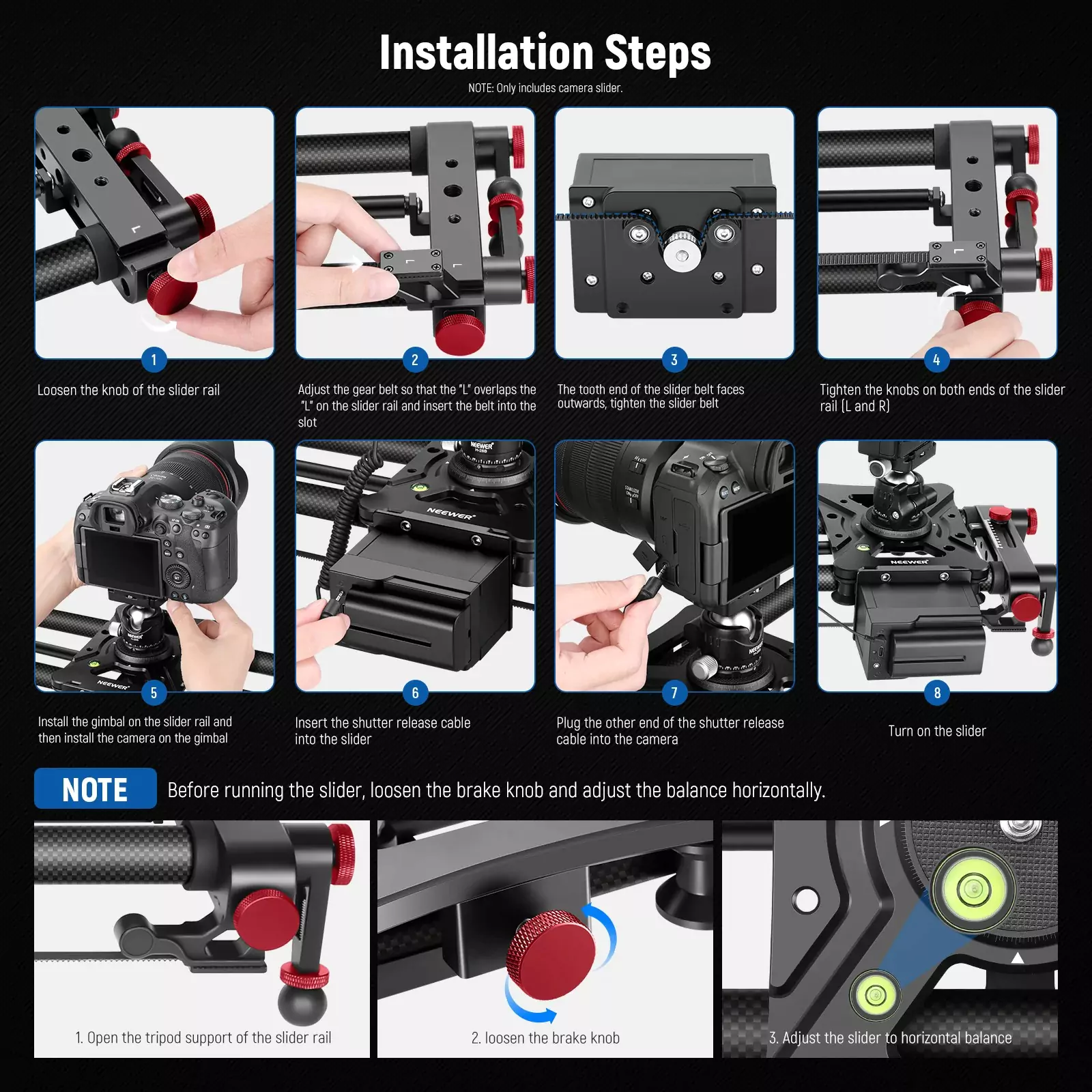 اسلایدر NEEWER ER1-120 از مواد فیبر کربن و آلیاژ آلومینیوم ساخته شده که موجب سبکی و دوام بالای آن میشود. این اسلایدر به شما امکان تنظیم دستی و موتوریزه حرکت دوربین را میدهد و ویژگیهای قابل تنظیم مختلفی مانند سرعت حرکت، روش لغزشی (سرعت ثابت یا شروع/توقف آهسته)، نقطه A/B و حلقه را در اختیار شما قرار میدهد. همچنین، این اسلایدر به شما این امکان را میدهد که از راه دور و با استفاده از کنترل بیسیم، فاصله زمانی، سرعت شاتر و زمان نوردهی را تنظیم کنید.